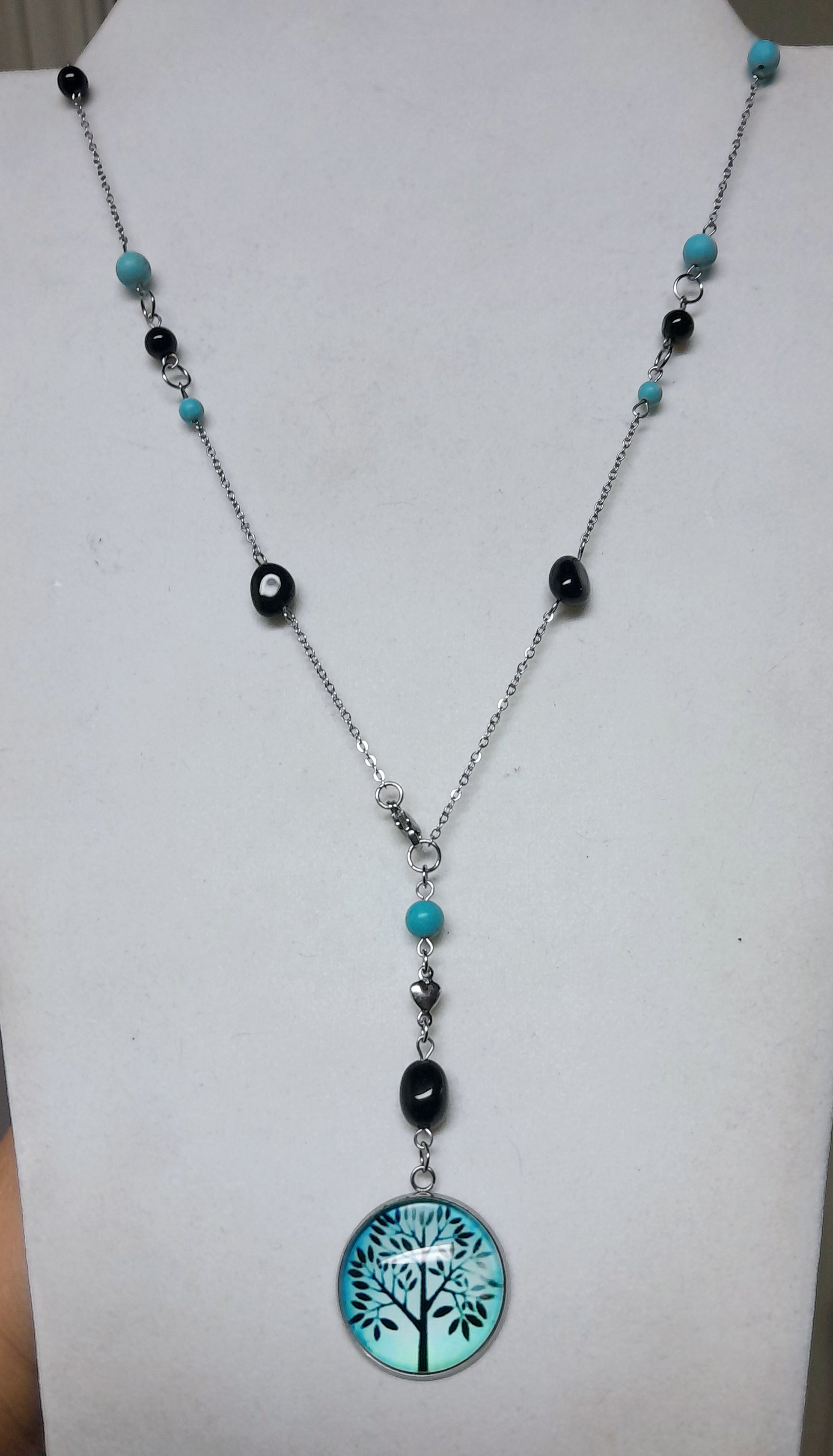 Collier long en acier inoxydable hypoallergene avec howlites turquoises et Jaspe noir qui s'agencent à merveille avec le cabochon de 25 mm arbre de vie du même ton ! Une attache au devant permettant de porter le modèle à sa pleine longueur ou double rang près du cou !