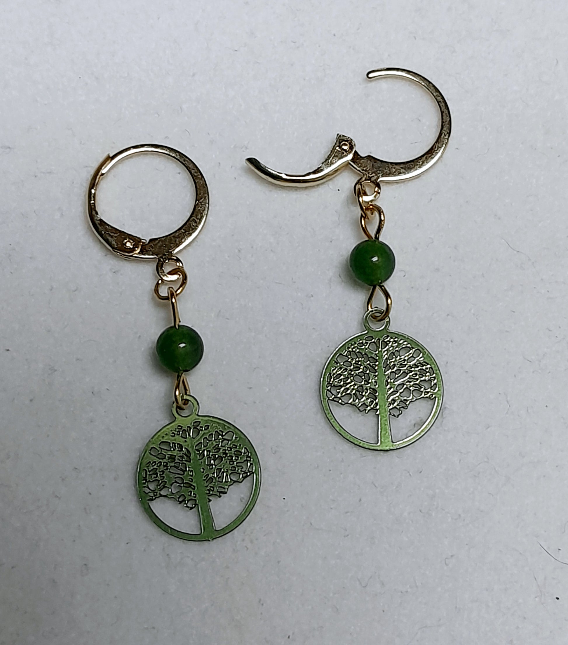 Boucles d'oreilles dormeuses en acier inoxydable doré avec Jades et ses arbres se vie verts 1,5 pouces de longueur