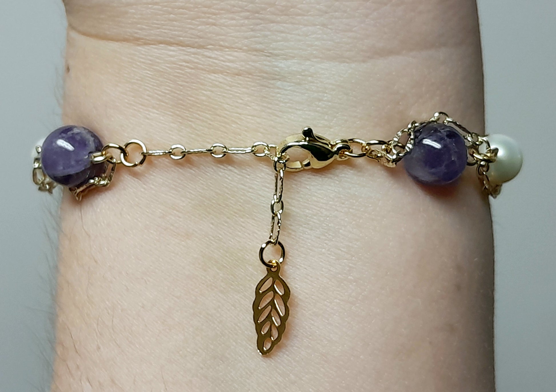 Bracelet en acier inoxydable ton OR avec perles d'eau douce blanches et Améthystes torsadé d'une jolie chaîne ! S'attache de 7 à 8,5 po