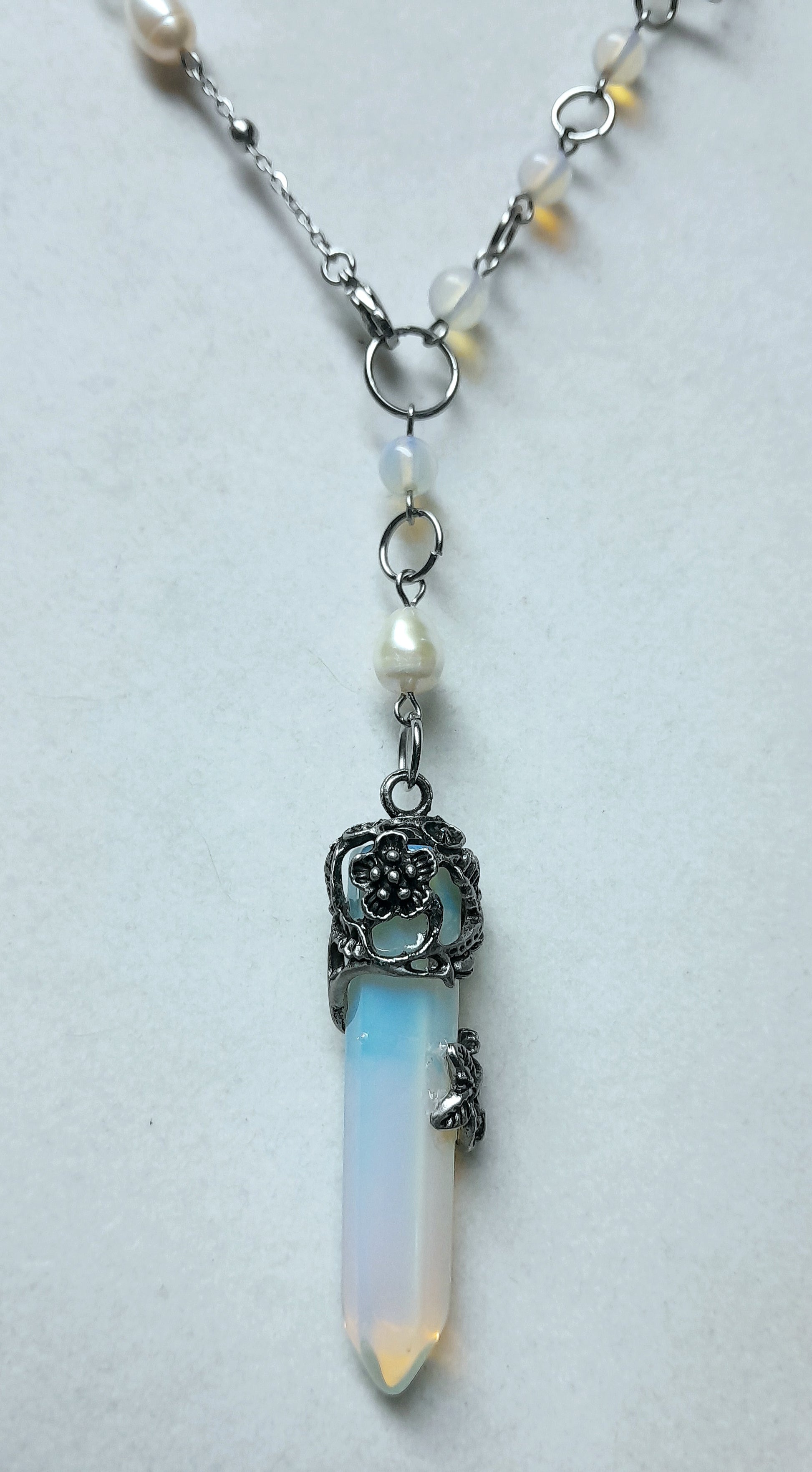 colliers longs pendules ! Chaîne en acier inoxydable avec Opalites et perles d'eau douceblanches! Portez-le long au niveau du plexus, double tour donc plus court ou détachez le et faites du pendule si désiré